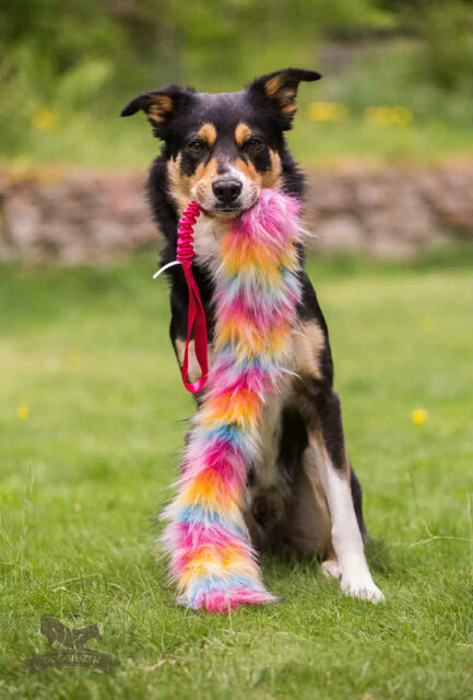 Doggie-Zen – Træklegetøj.Dette farvestrålende legetøj er til dem, der ønsker et robust legetøj i imiteret pels med masser af tyggeoverflade.Det elastiske håndtag gør legen både sjov og skånsom for dig og din bedste ven.• Langt håndtag, så du ikke skal bøje dig ned til mindre hunde eller hvalpe.• Kunstpelsen er tyk og slidstærk, og hunde elsker den.• Den elastiske del reducerer ryk for både hunden og træneren under leg.• Håndtaget er lavet af slidstærke produkter.• Doggie-Zen legetøj er lavet til aktiv leg mellem hund og træner, det er ikke lavet til at hunden kan ligge og tygge på.Str. LNedenstående ses eksempler på hunderacer og størrelser:M: Whippet, Cocker, Welsh Springer Spaniel osv.L: BC, Labrador, Golden retriever osv.XL: Rottweiler, schæferhund, mastiff osv.